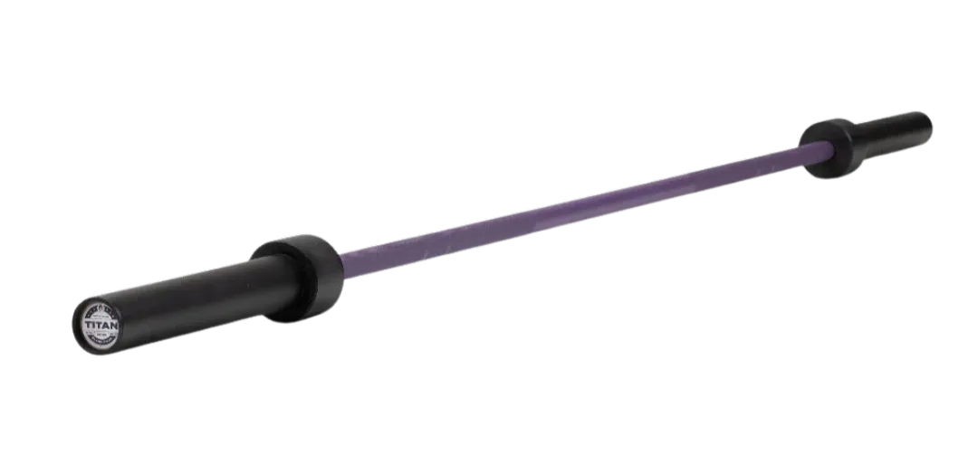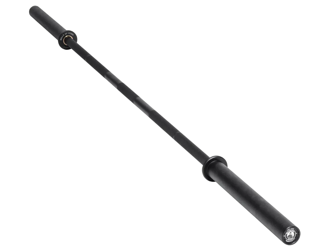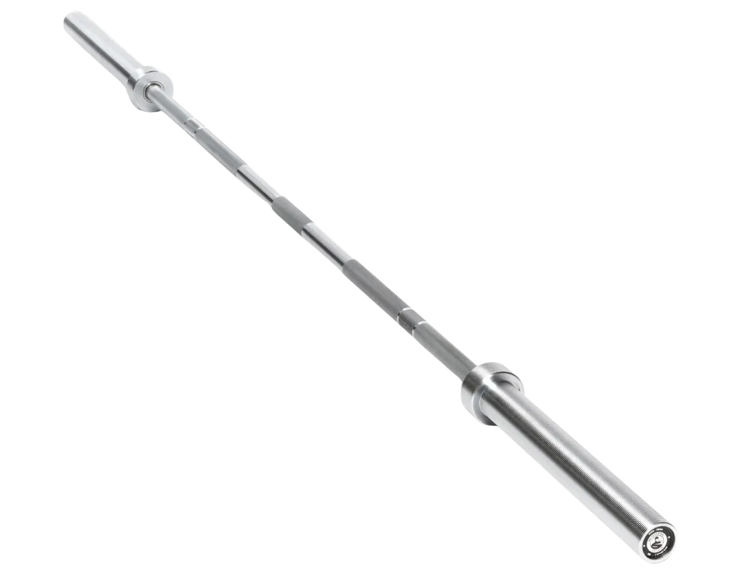 Solid sleeves, with bushings and sleeves with bearings that allow the bar to “spin” while loaded, 7.2 ft long (2.2m), standard bar diameter (28mm), 44 pounds (20kg), has more flex (called “whip”) than a powerlifting barbell, built to take a beating of being dropped repeatedly