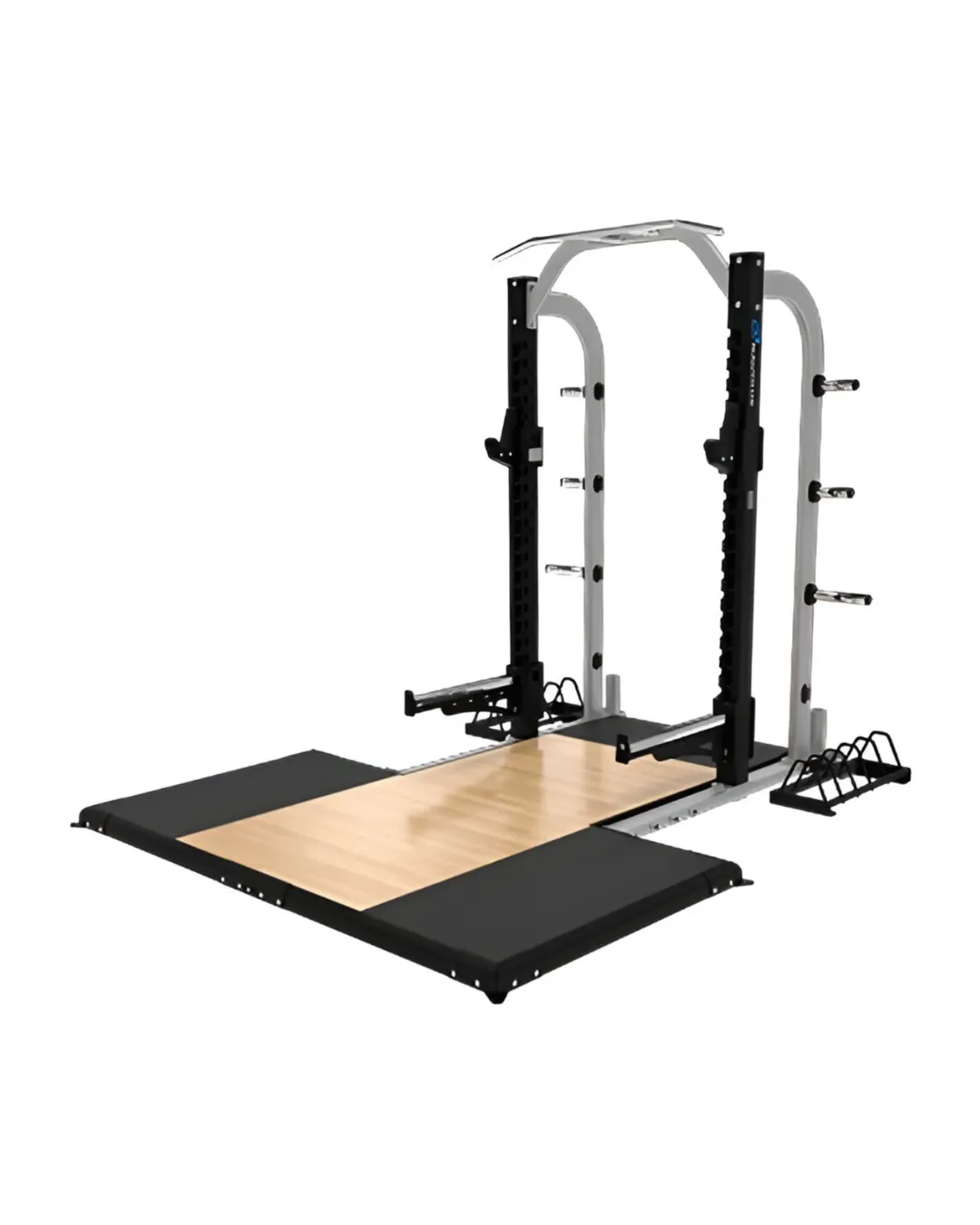 Not just squat racks! Olympic Platforms are very specifically designed to allow an athlete to perform explosive power movements such as the clean and the snatch. Noted for its center wooden platform and hard, but absorbant black (or other colored) flooring on either side of the wooden center, Olympic platforms are often incredibly well built and sturdy.